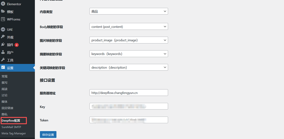 6. 配置插件:插件激活后,在 WordPress 后台左侧菜单栏中会出现 “Get Deepflow Content” 选项。点击该选项,进入插件的配置页面。在配置页面中,你需要填写与 DeepFlow 平台相关的连接信息,如内容类型、Body映射的字段、图片映射的字段、摘要映射的字段、关键词映射的字段、服务器地址、Key、Token。填写完成后,点击 “保存设置” 按钮,确保配置信息生效。