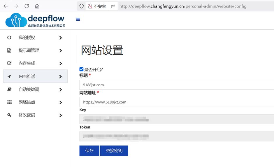 7. 获取Key和Token:从Deepflow平台的网站设置菜单中(http://deepflow.changfengyun.cn/personal-admin/website/config),可以获取到这两个值。